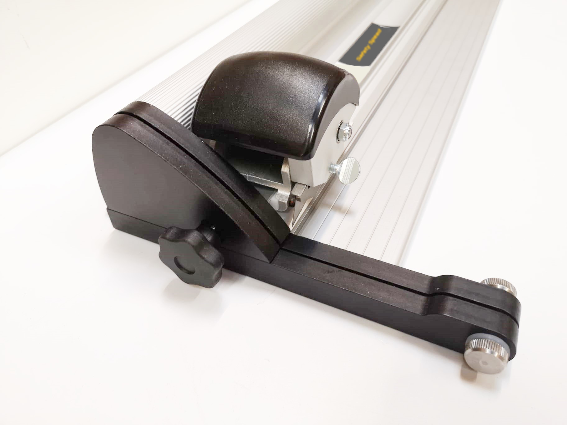 Cut Substrates the easy way with the Helios substrate cutter. This unit features a strong anodized aluminum base that incorporates dual cutting tracks, one for the utility blade and another for the standard cutting wheel. It is fitted with an integral leveling adjustment allowing the cutting bar to sit flat on any thickness of material up to ¾” (20mm) thick. The cutting head includes a magnetic blade magazine which accepts utility blades and acrylic scoring blades. A 45mm textile cutting wheel and holder is also included as standard equipment.